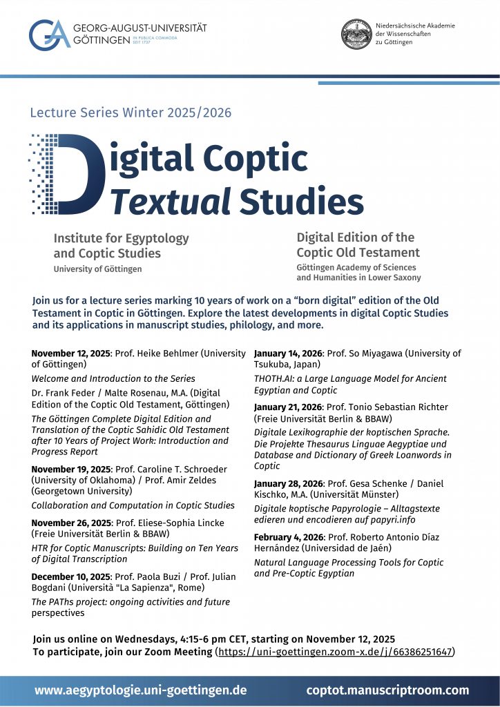 The Institute for Egyptology and Coptic Studies, University of Göttingen, and the project Digital Edition of the Coptic Old Testament, Göttingen Academy, invite you this winter for a new lecture series on Digital Coptic Studies. The series brings together leading scholars exploring how digital technologies are reshaping the study of Coptic language and manuscripts.